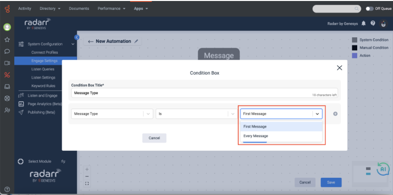 • First Message – If we select the “First Message” the automation rules set up will execute the rule only if the First message satisfies the conditions